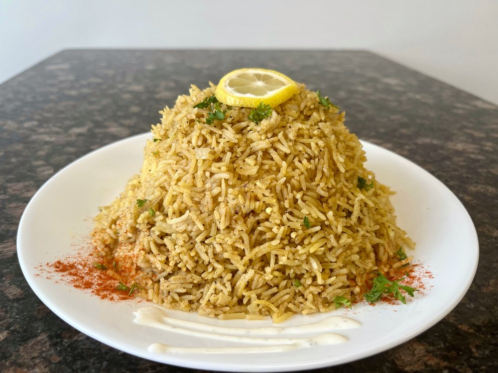 Marinated chicken breast, Mediterranean rice, side of hummus & salad.