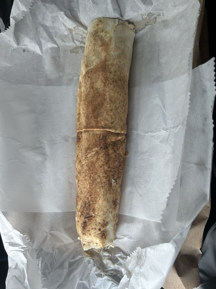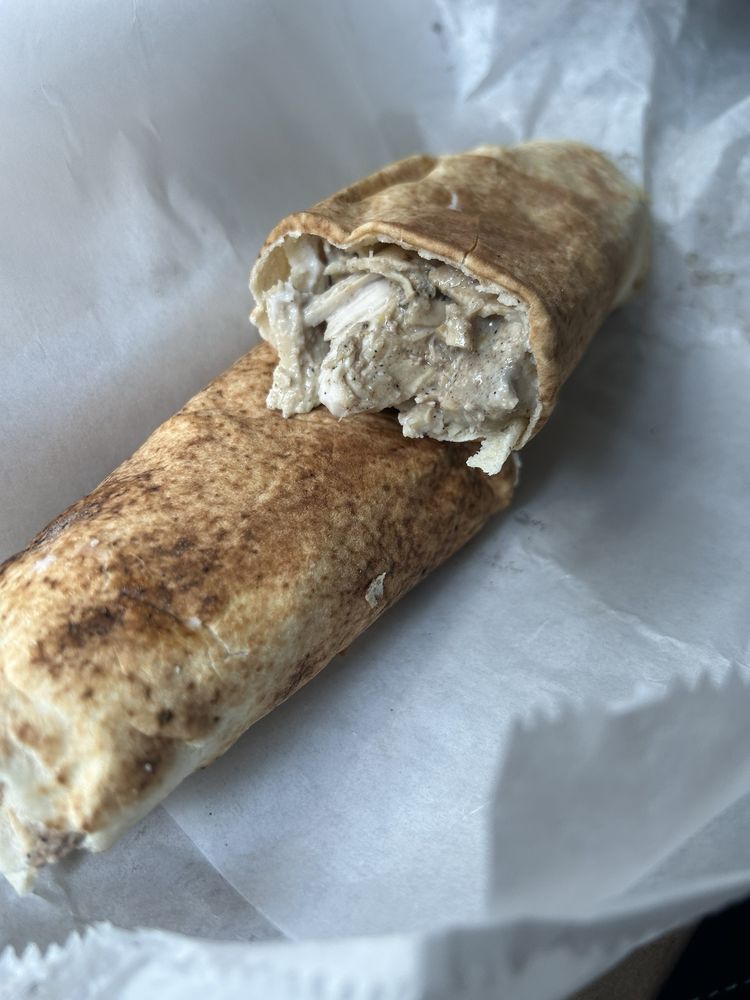 Seasoned shaved chicken Shawarma, signature garlic sauce, pickles, pita bread.