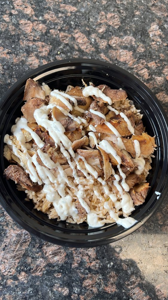 Seasoned shaved chicken breast & thigh, Mediterranean rice, side of hummus & salad, with garlic sauce.